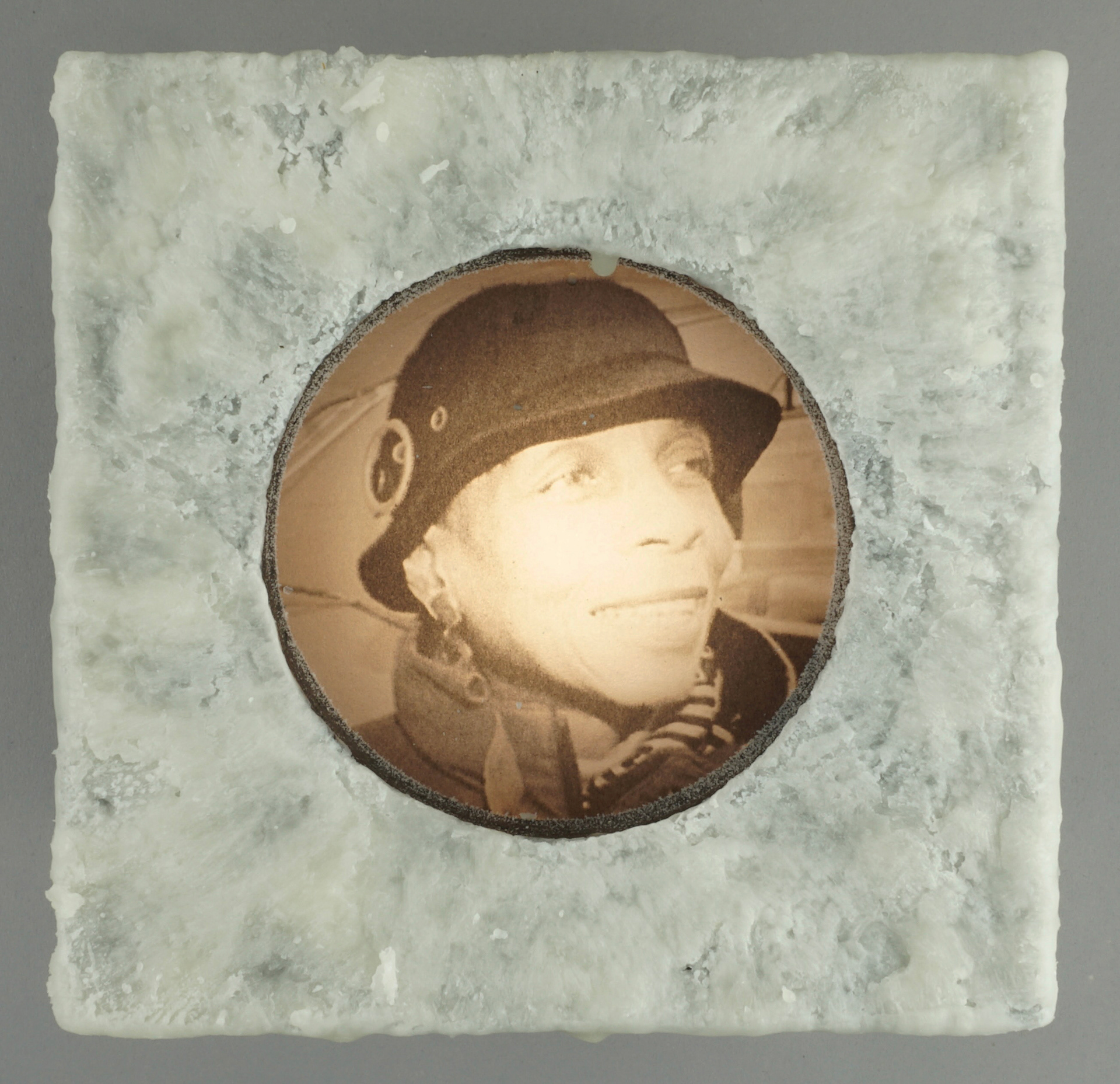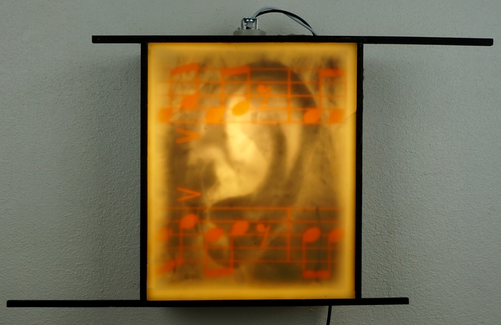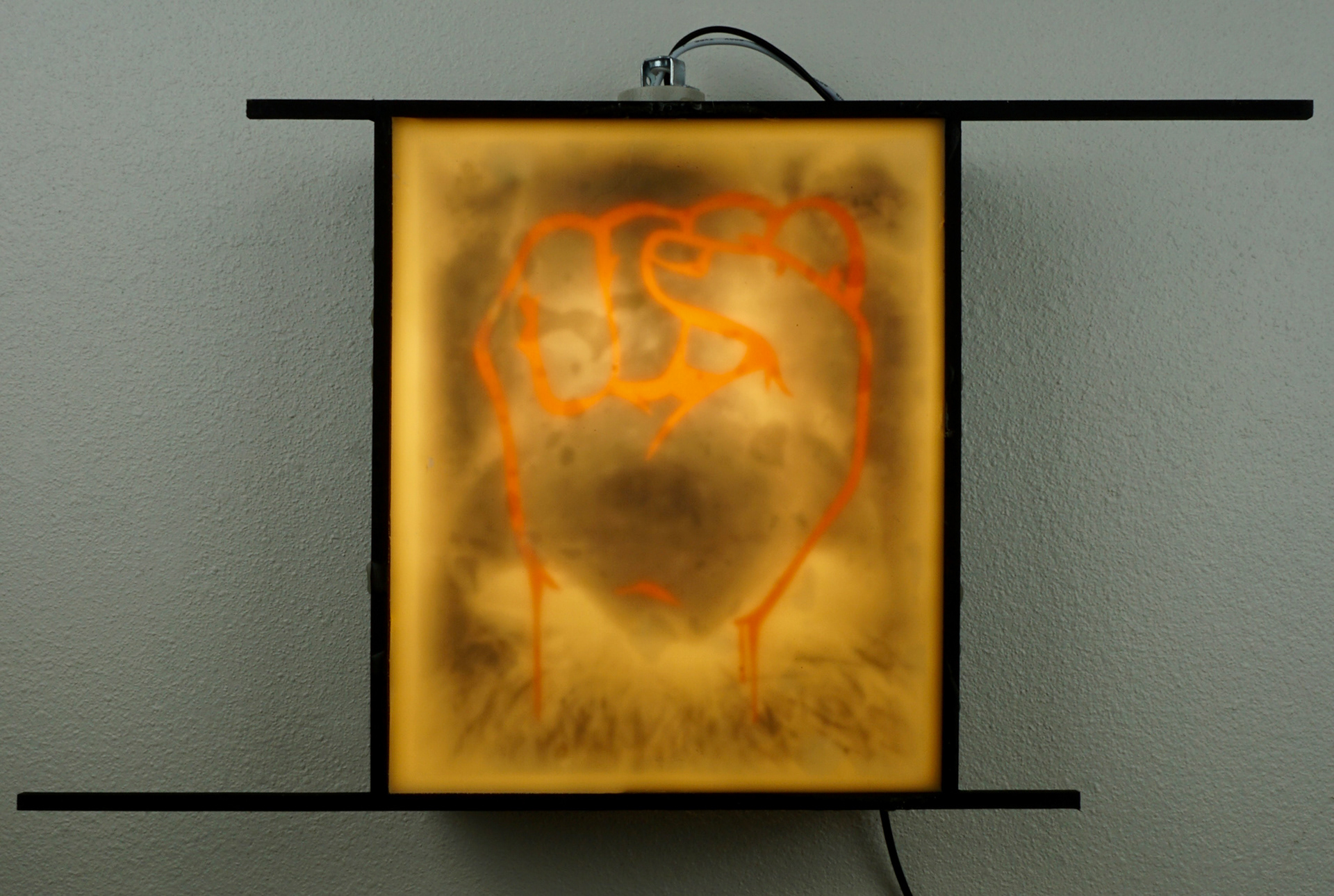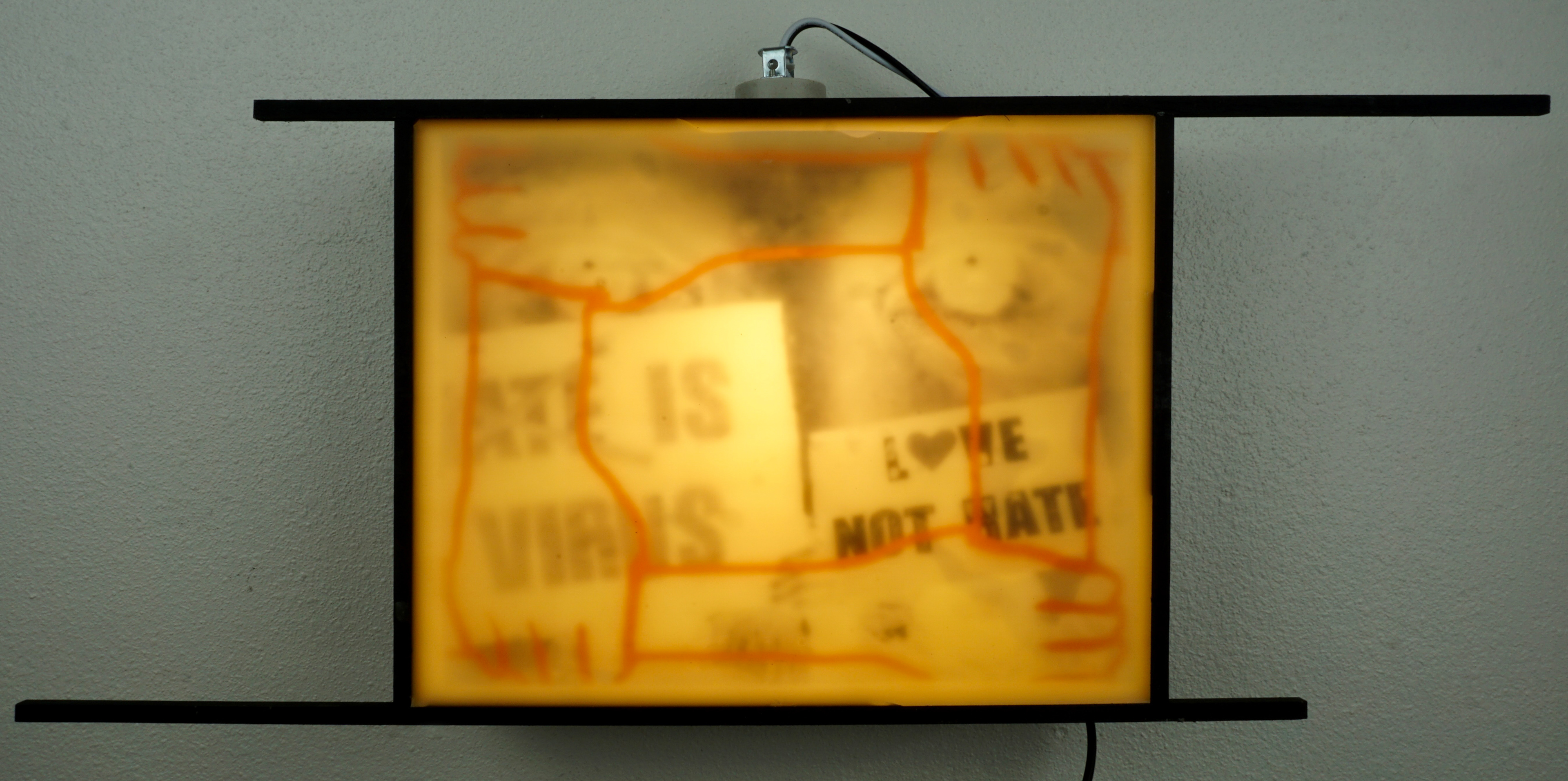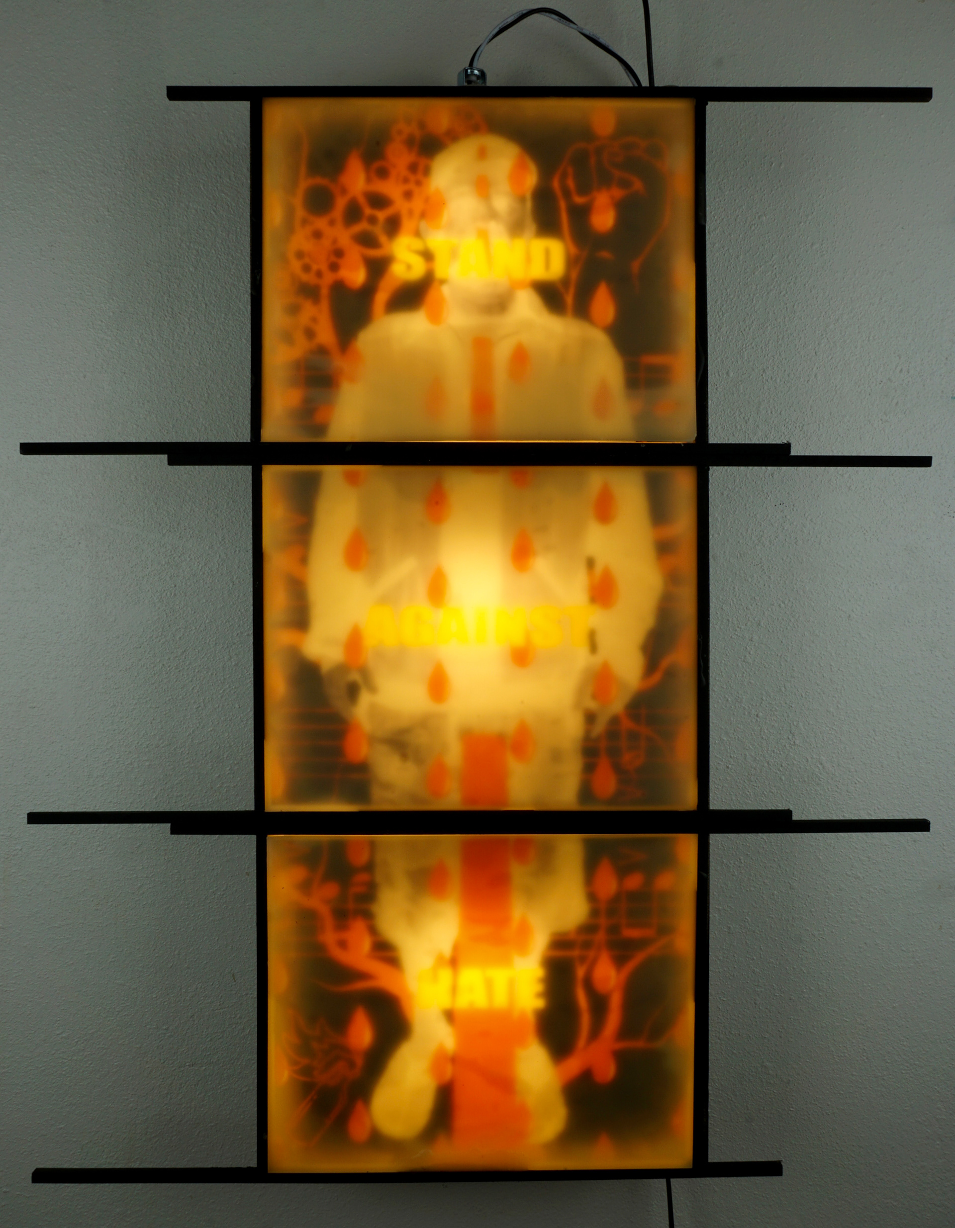 The first body of work is seven pieces of both original and found imagery around a central triptych. The pieces are images printed on transparencies, covered with wax, and illuminated from behind in wood lightbox frames. Each frame has pieces that extend out at the top and bottom. This symbolizes reach, when the pieces are installed and viewed as one piece it is as if each piece is reaching out to another piece and beyond the body of work, and the ideas it is discussing, as a continuation or relay of the conversation. Along with the reference to the candle, light, and truth, a conceptual intention was to use the wax to mute, mask, or suppress the message, as hate desires to oppress, suppress, or silence another. Visually the sheets of wax over the images create a muted dreamlike feeling that seems to question the reality of the image by revealing something that is beautiful but slightly visually unclear.