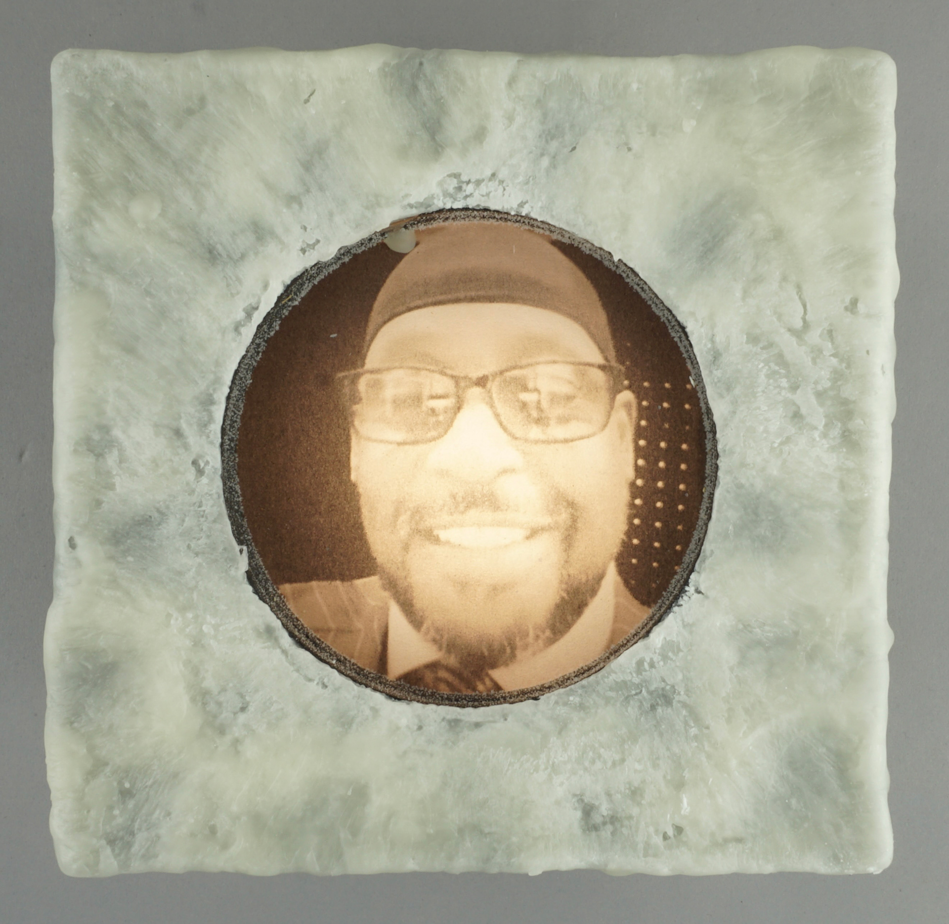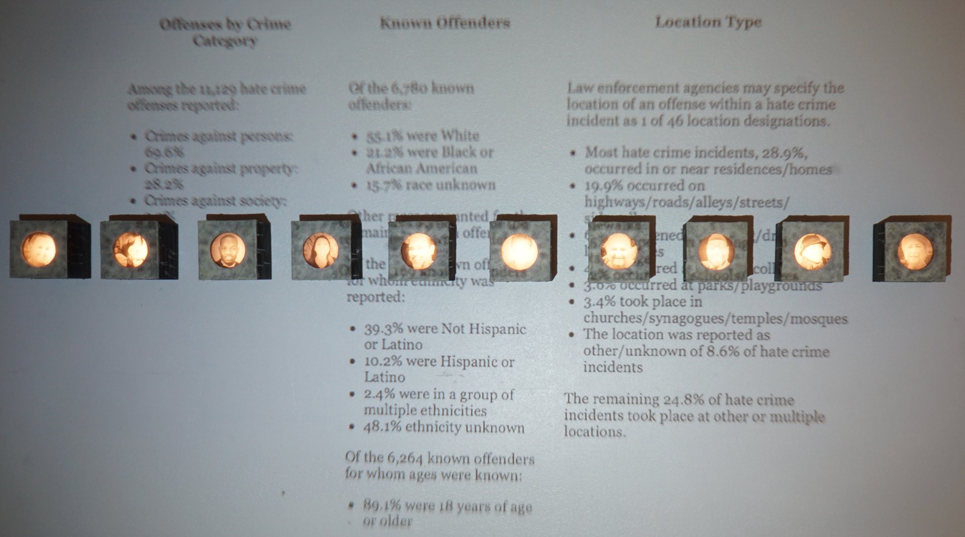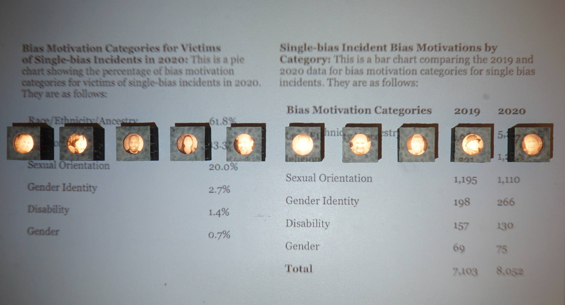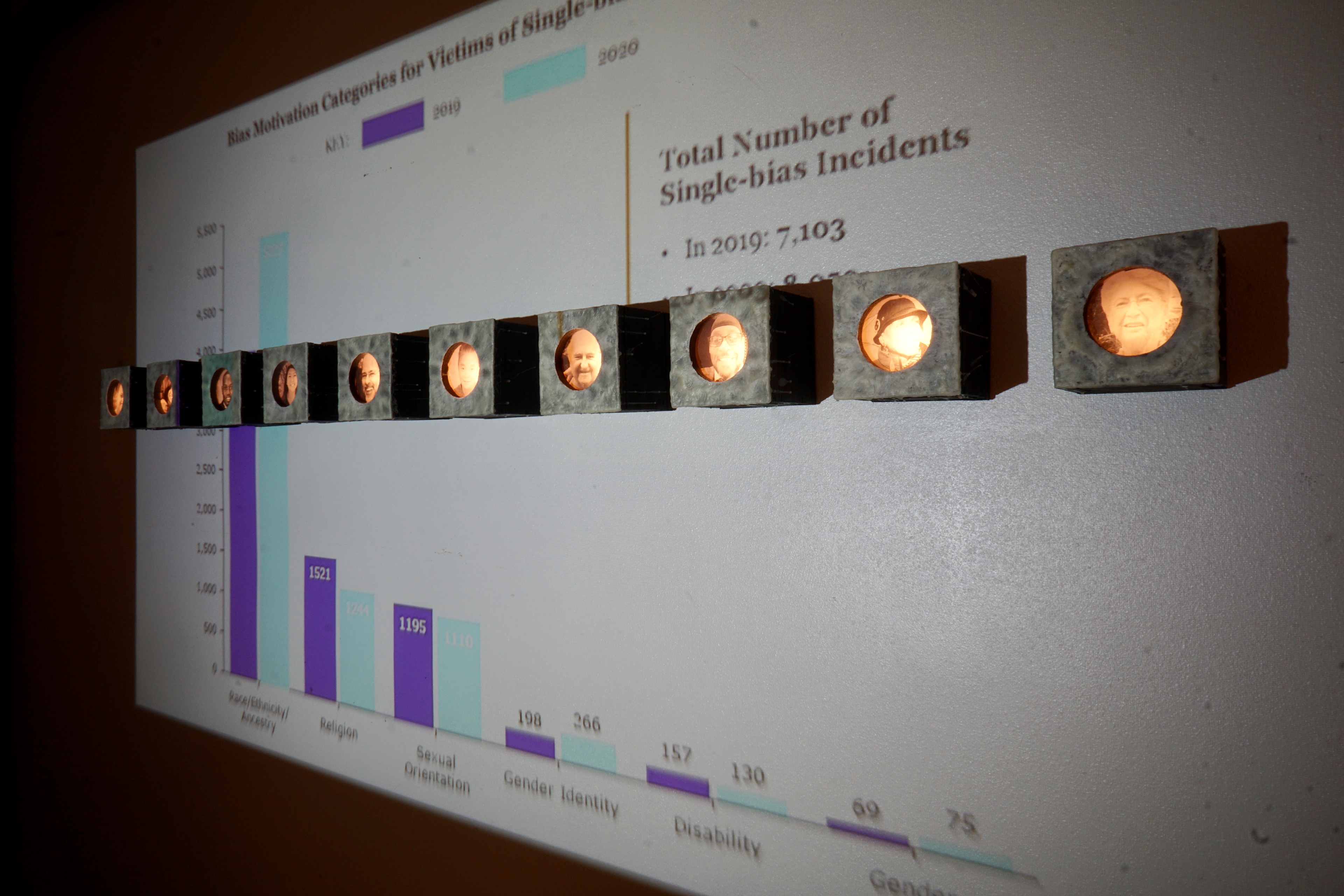 For the second body of work, transparencies of found portraits of victims of hate crimes are displayed in wood light boxes. Brushed wax is on the face of the lightboxes once again referencing the candle and its symbolic reference of illumination and truth. As part of this section of the installation, graphs and statistics were projected over the installed group. It is an attempt to show that they are real people and reveal how these real people are, unfortunately, so often reduced to a statistic, which is a fact that both the viewer and the work bear witness to.